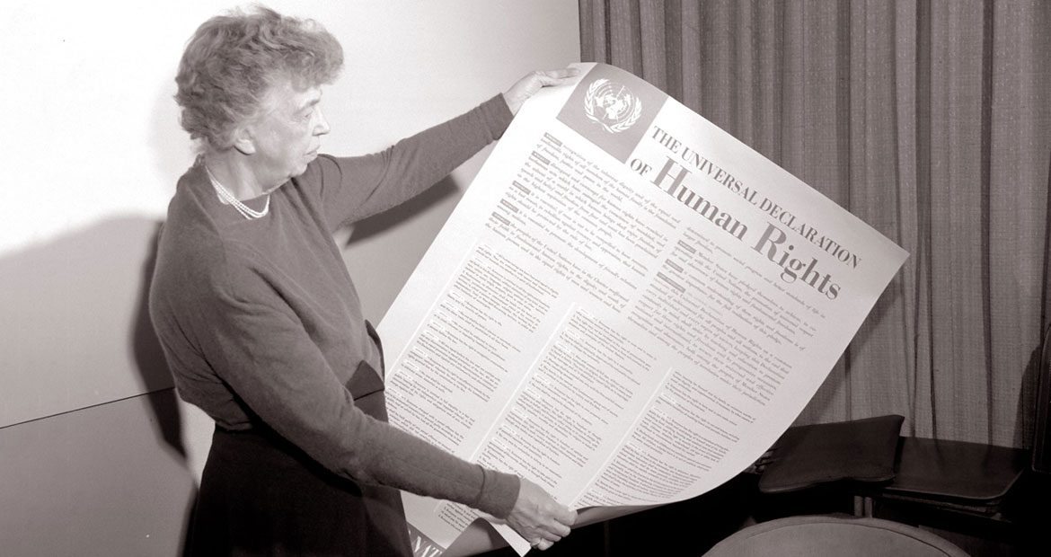 Suruhanjaya Hak Asasi Manusia PBB yang ditubuhkan pada tahun 1946 pada permulaannya dipengerusikan oleh seorang wanita bernama Eleanor Roosevelt. Beliau adalah balu kepada bekas presiden Amerika Syarikat, Franklin D. Roosevelt (meninggal dunia pada tahun 1945) lantaran juga mantan Wanita Pertama Amerika Syarikat.